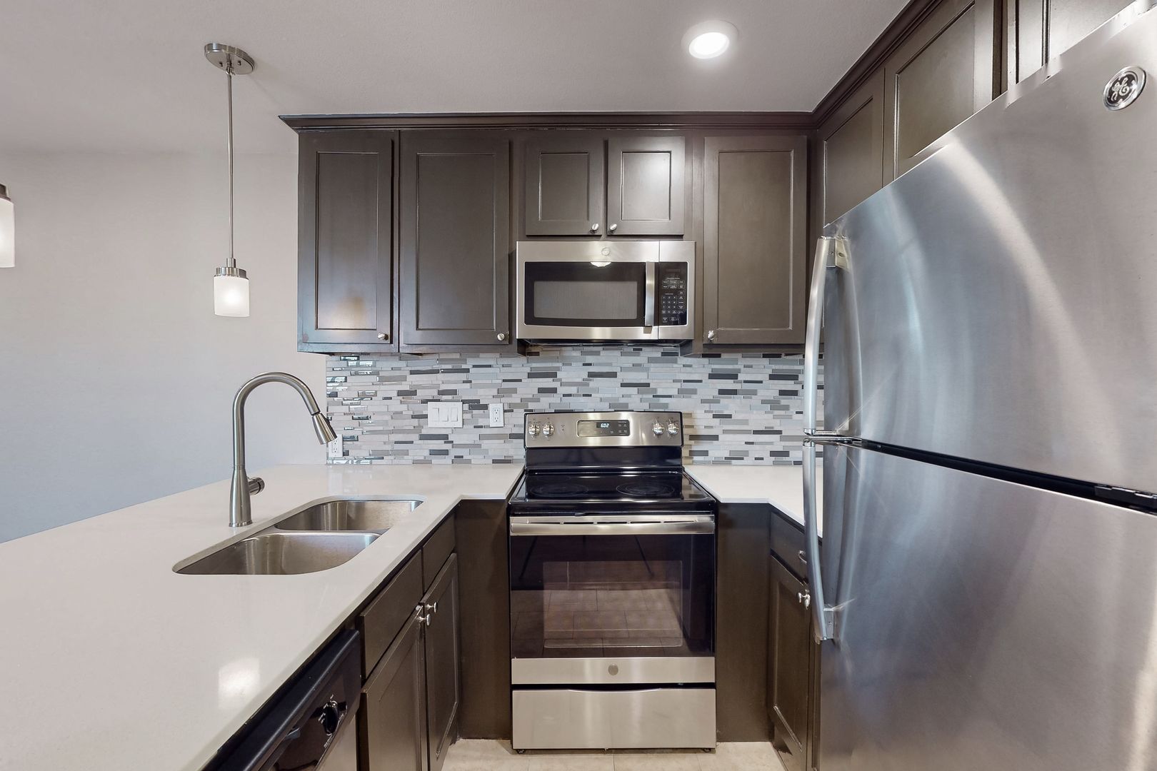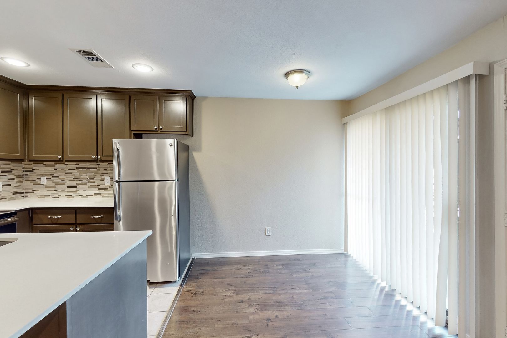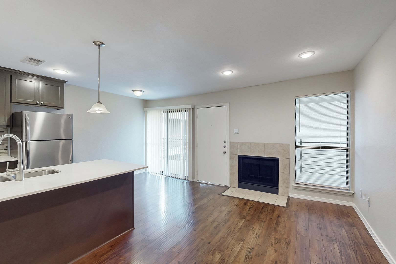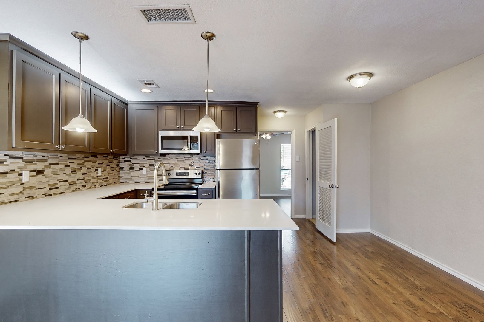 Updated and beautifully renovated apartment featuring a new kitchen and bathroom, complete with cabinets, quartz countertops, laminate flooring, and modern light and plumbing fixtures. The kitchen opens up to the living room, which is illuminated by recessed lighting throughout.